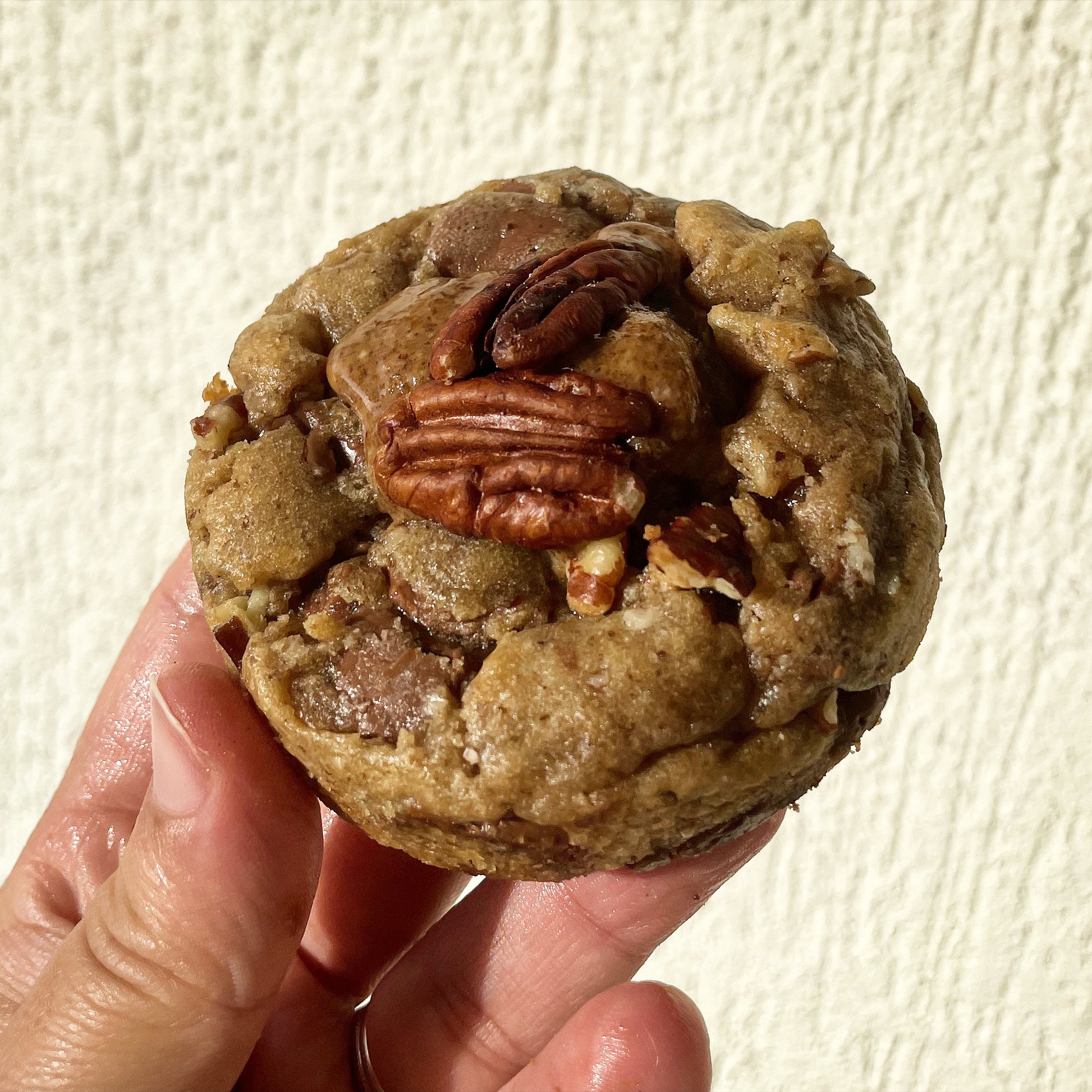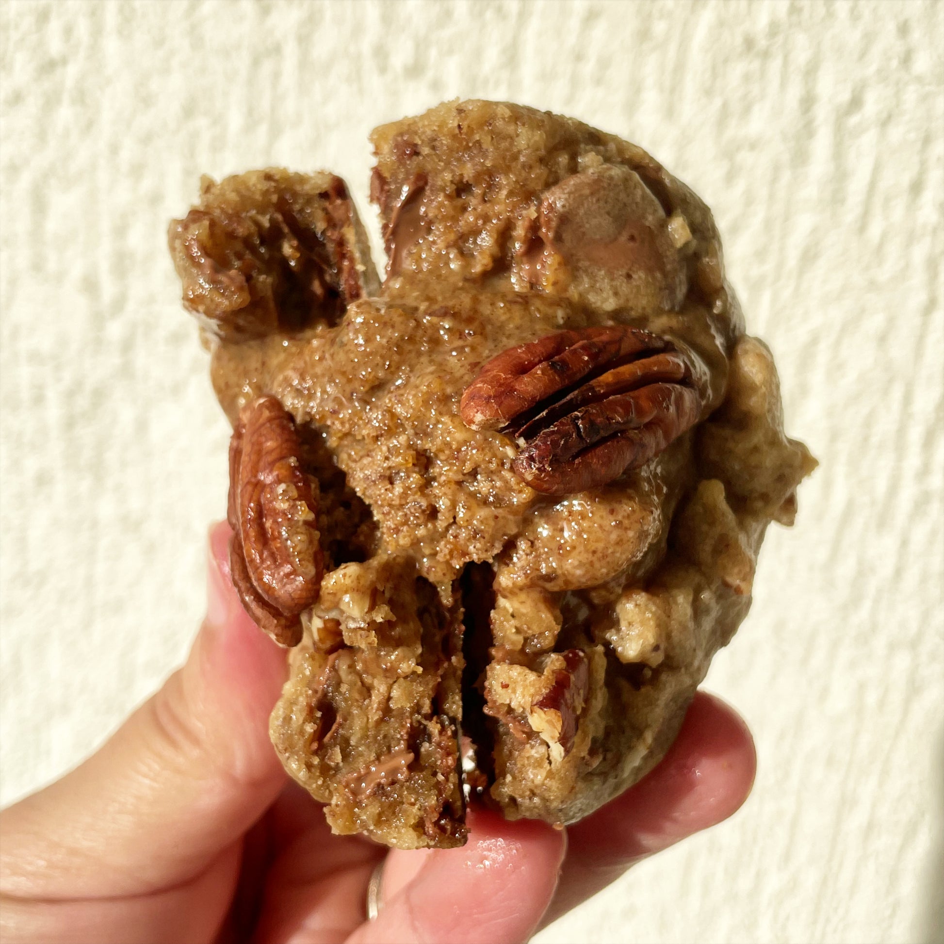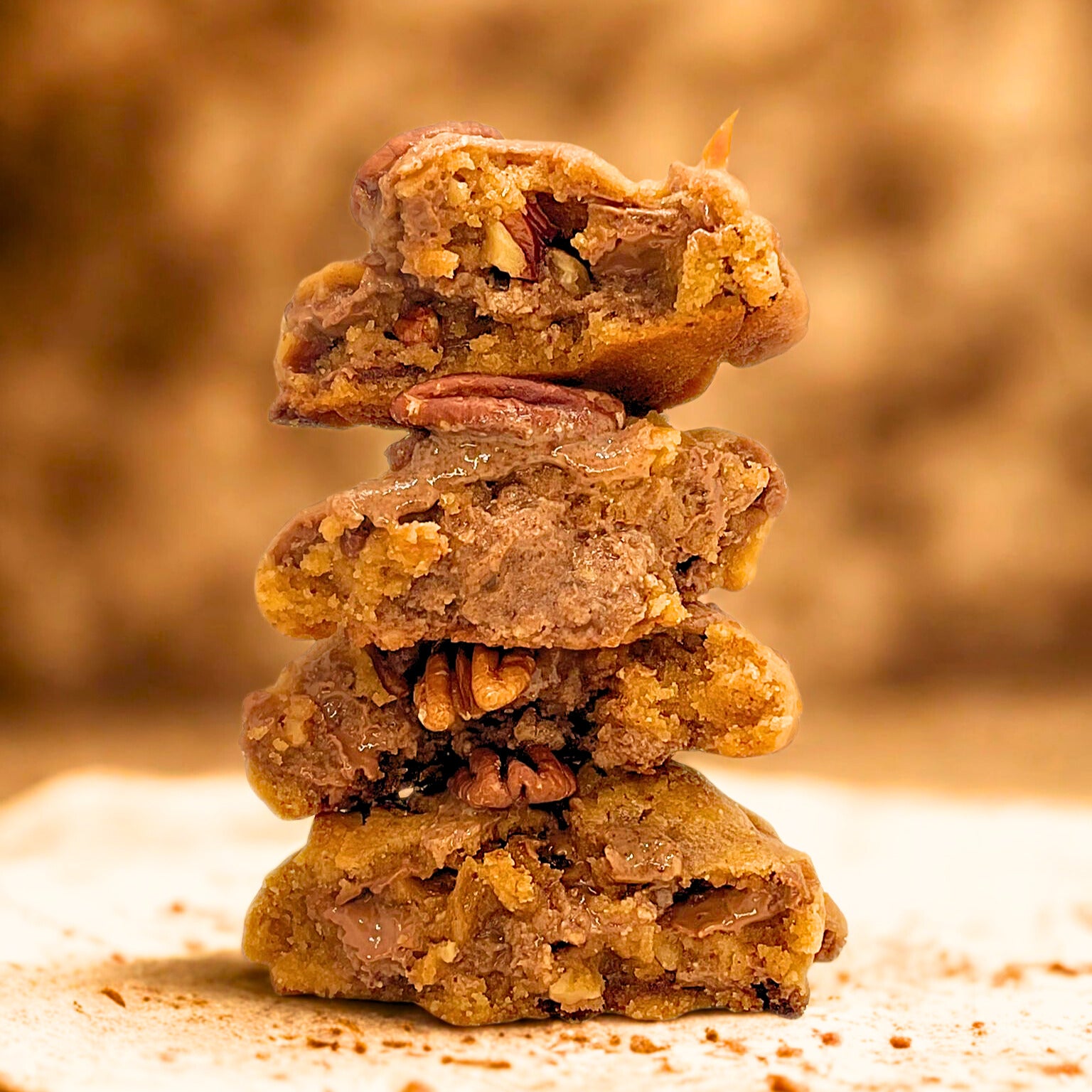 Base chocolat au lait fondante, pécans croquantes, cœur praliné pécan et filet de sirop d’érable… Un cookie qui te réchauffe le cœur et les papilles, parfait pour affronter le froid !