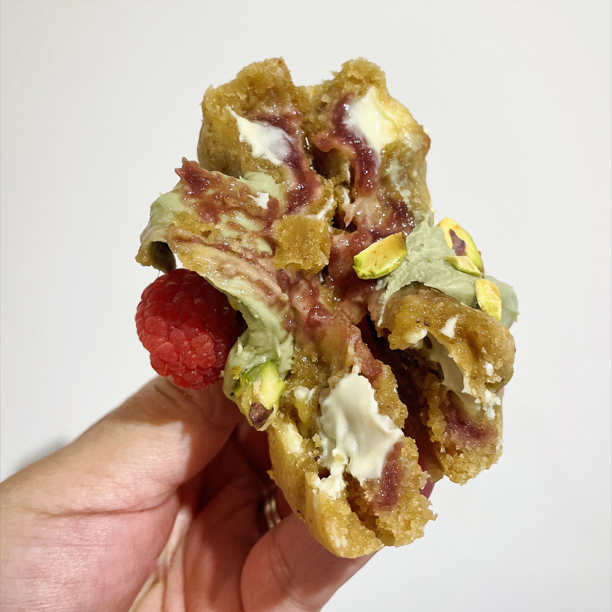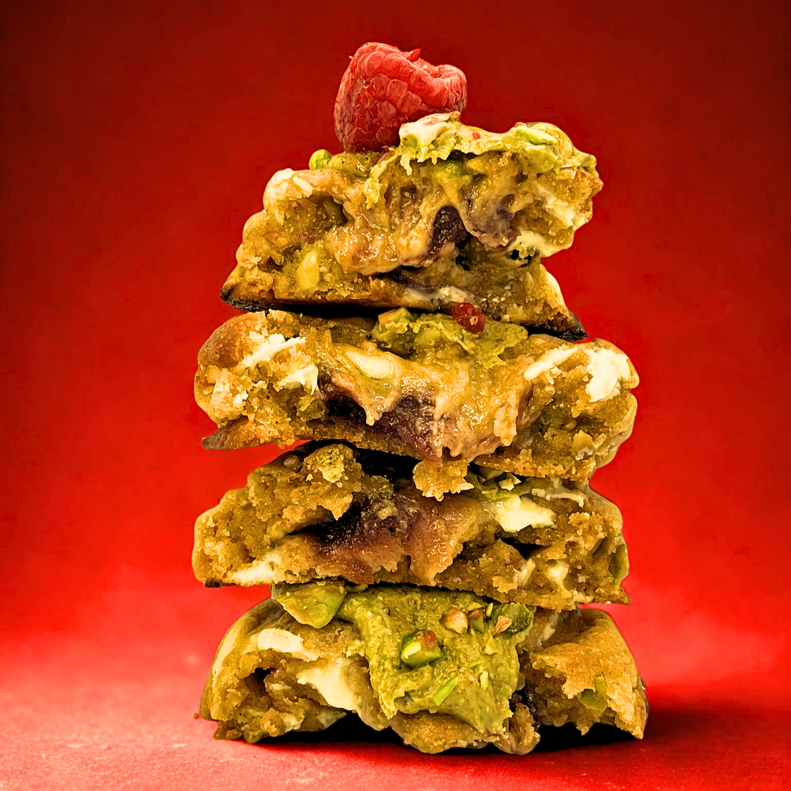 Base chocolat blanc fondante, éclats et crème de pistache, coulis de framboise acidulé et framboises fraîches juteuses… Un cookie frais, coloré et irrésistiblement craquant.