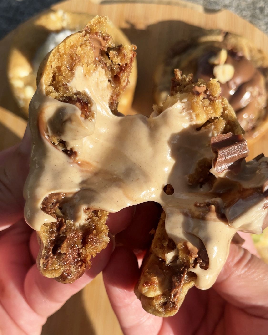 Le cookie qui met tout le monde d’accord : pâte fondante au chocolat au lait, éclats de noisettes croustillants et un cœur coulant façon Bueno. Croquant, fondant, décadent.